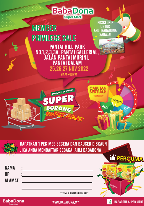 28 October 2022 to 30 October 2022 – Member’s Day @ BabaDona Super Mart, Saujana Puchong Permai, Selangor.
